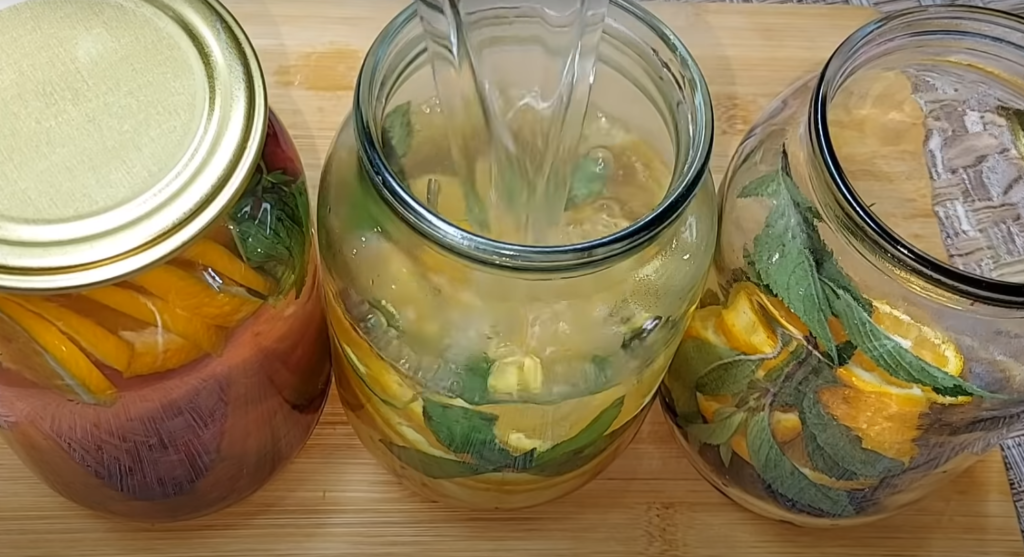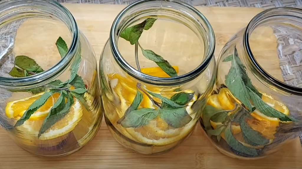 Kolejno włóż kilka plasterków pomarańczy do każdego pojemnika i dodaj gałązkę mięty.