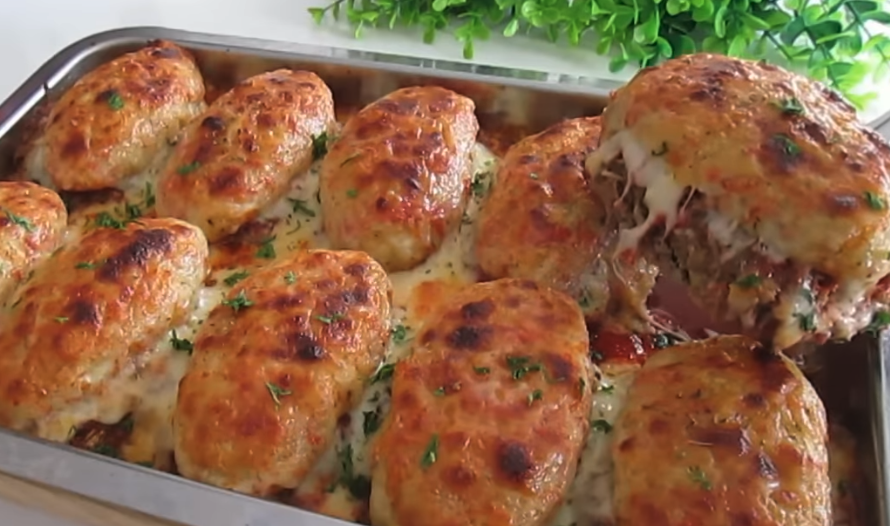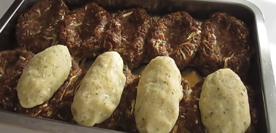 Z farszu formuj duże klopsiki, umieść je na blasze i zrób w każdym wgłębienie. Piecz klopsiki w piekarniku nagrzanym do 220°C przez około 30-35 minut. Wyłóż ugotowane ziemniaki na każdym klopsiku. Rozcieńcz koncentrat pomidorowy w gorącej wodzie i polej nim klopsiki.