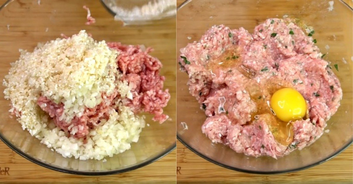 3. Do mielonego mięsa dodaj białko, posiekaną drobno cebulę, ryż, dopraw do smaku solą, pieprzem i przyprawami. Dokładnie wymieszaj całość.