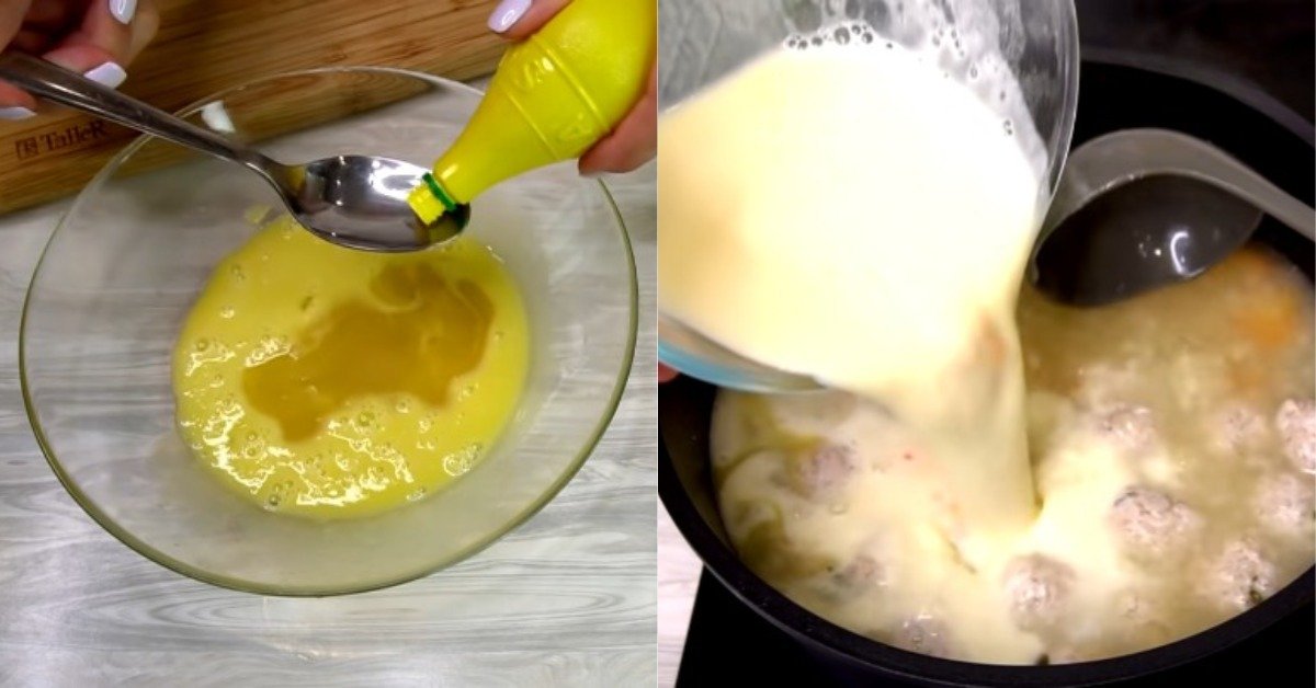 5. W osobnej misce ubij 2 jajka z sokiem z cytryny, dodaj 100 ml schłodzonego bulionu i dokładnie wymieszaj.