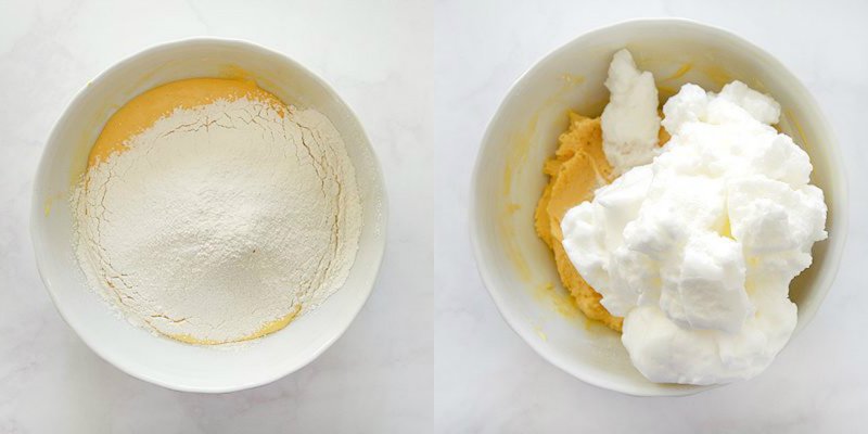 2. Schłodzone białka, ubij na sztywną pianę ze szczyptą soli i połącz delikatnie mieszając łyżką od dołu do góry z zawartością pierwszej miski.