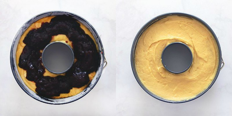 3. Formę, wysmaruj masłem i posyp bułką tartą. Wyłóż do niej połowę ciasta, a na nie rozprowadź ulubiony dżem lub powidła. Potem, zalej pozostałym ciastem.