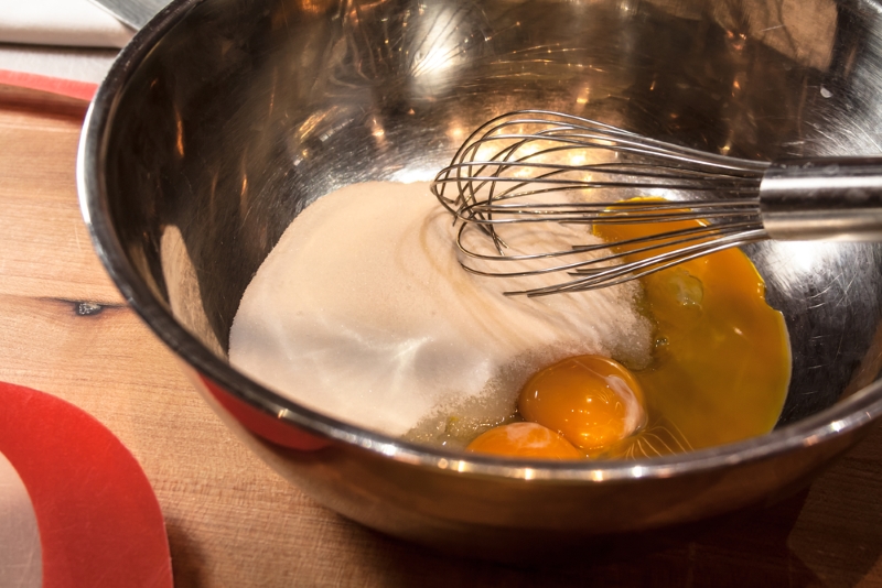 3. W międzyczasie wymieszaj jajka z cukrem. Dodaj namoczone, suszone owoce wraz z mieszanką w której się moczyły (herbata z whisky). Wymieszaj wszystko i dodaj gałkę muszkatołową i cynamon. Te przyprawy nadadzą babce niezwykły aromat.