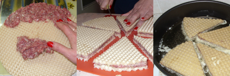 2. Na jednym waflu, rozłóż porcje mięsa, przykryj drugim waflem i lekko dociśnij. Pokrój całość na 6 trójkątów, procedurę powtórz z pozostałymi waflami i farszem mięsnym.