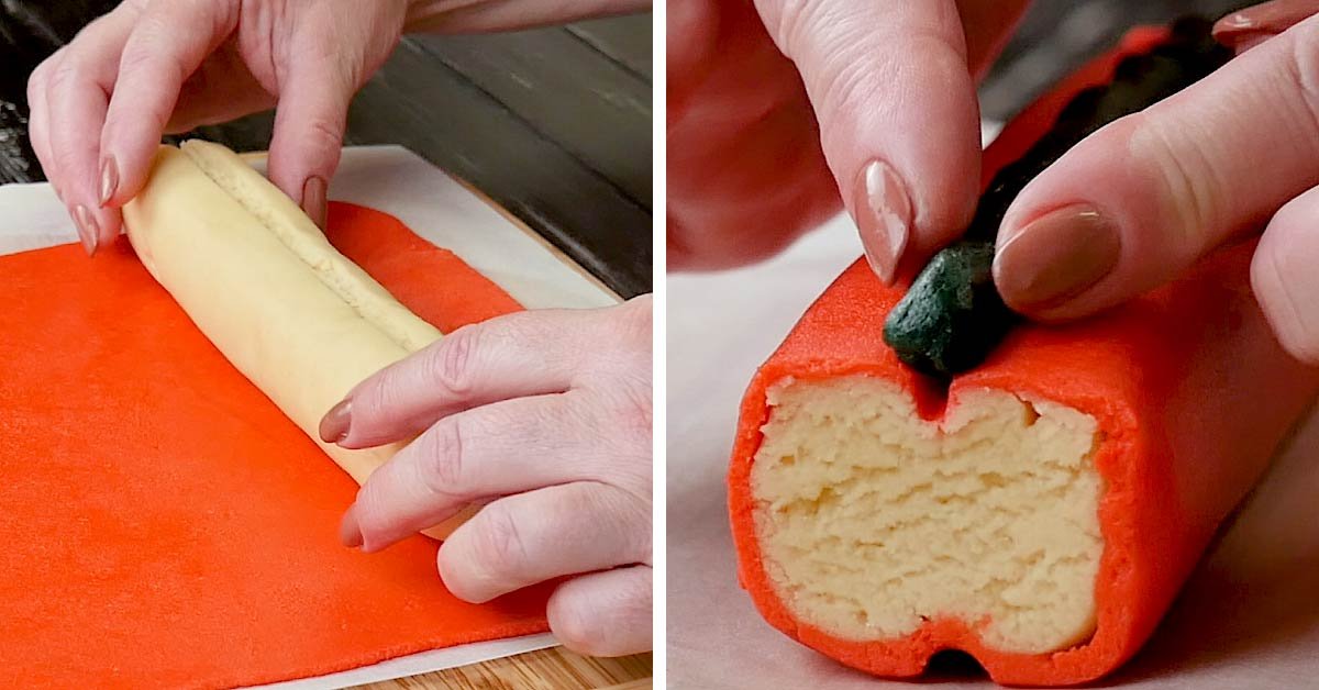4. Z białej części ciasta bez barwnika, uformuj wałeczek i zrób po obu stronach wzdłuż ciasta wgłębienie. Owiń szczelnie czerwonym ciastem, odetnij wystające krawędzie, a w jedno wgłębienie włóż wałeczek z zielonego ciasta.