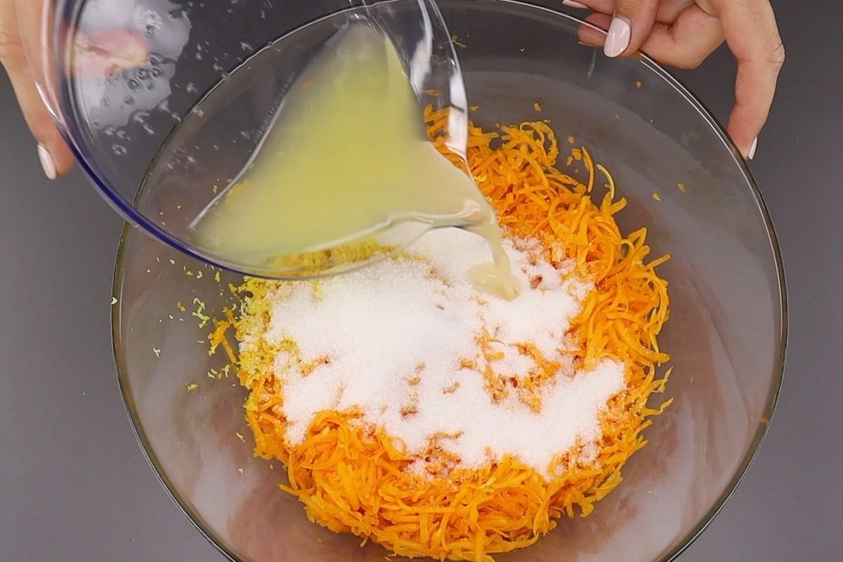 1. Dynię obierz ze skóry i usuń dokładnie wszystkie pestki. Następnie, zetrzyj ją na tarce o grubych oczkach. Przełóż dynię do dużej miski, dodaj 100 g cukru, sok z cytryny (możesz również dodać startą na tarce skórkę z cytryny – dla intensywniejszego smaku) i dokładnie wymieszaj.
