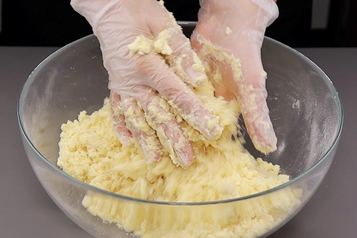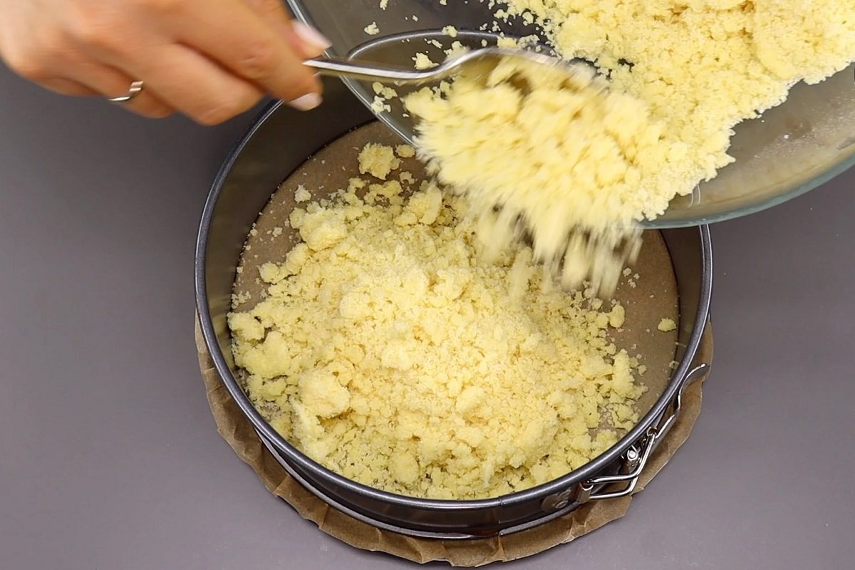 2. Teraz czas na ciasto: W misce, wymieszaj pozostały cukier, kaszę mannę, mąkę i szczyptę soli oraz starte na tarce miękkie masło. Zagnieć kruche ciasto.