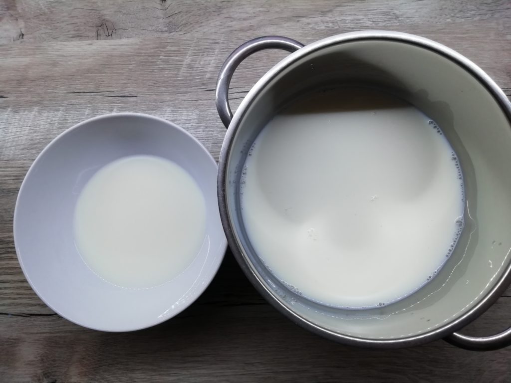 5. W pozostałym mlekiem, wymieszaj żółtka z mąką i cukrem waniliowym, a następnie wlej małym strumieniem do gotującego się mleka, nie przerywając mieszania.