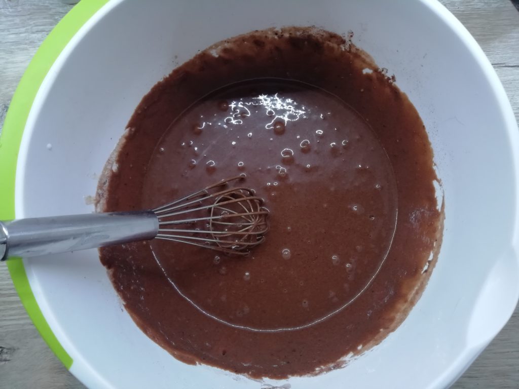 2. Do rozgniecionych bananów, dodaj jajka i sól. Ubij trzepaczką, dodaj kakao, proszek do pieczenia i dobrze wymieszaj.