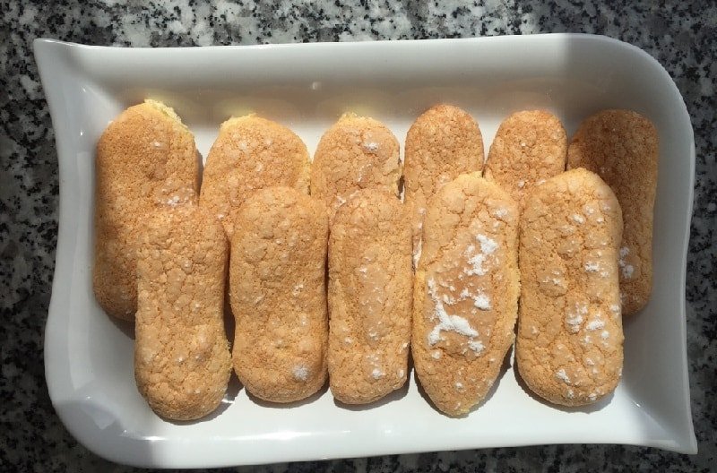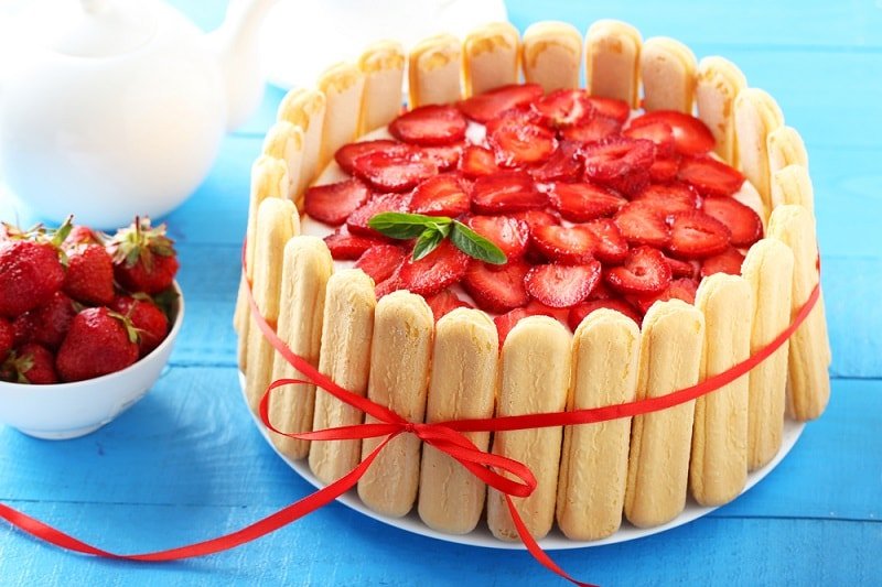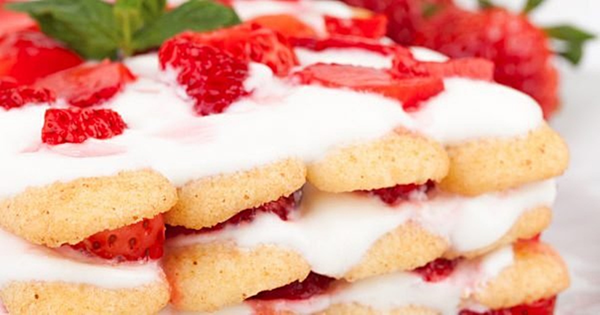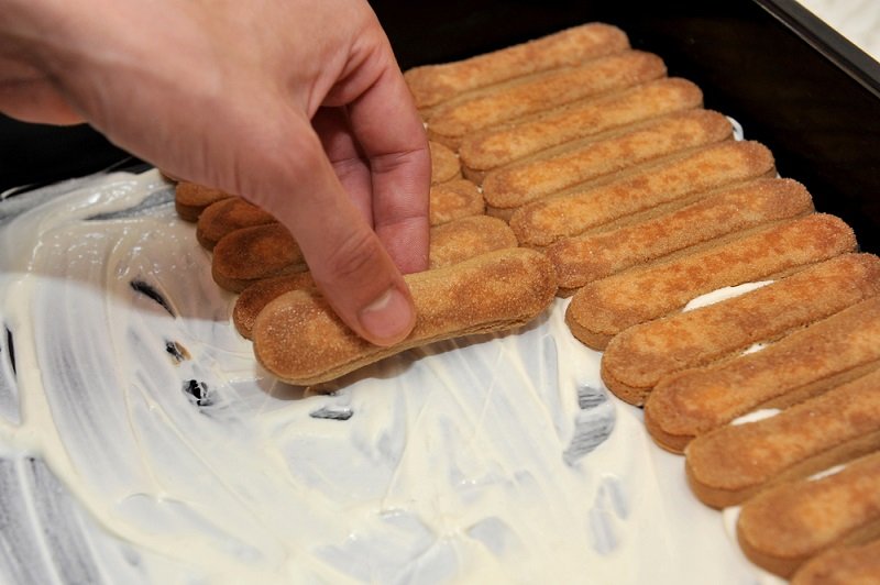 5. Czas na składanie warstw ciasta: Biszkopty namoczone wcześniej w mleku, ułóż na dnie formy (tj. trzy rzędy po 5 szt.) Następnie, nałóż grubą warstwę kremu, warstwę pokrojonych w plasterki truskawek. Warstwy układaj do wyczerpania składników.