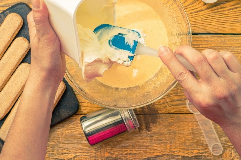 4. Teraz, wystudzoną masę budyniową wymieszaj mikserem, stopniowo dodając twarożek oraz wcześniej ubitą mikserem śmietankę. Jeśli krem jest za mało słodki, możesz dodać cukier puder.