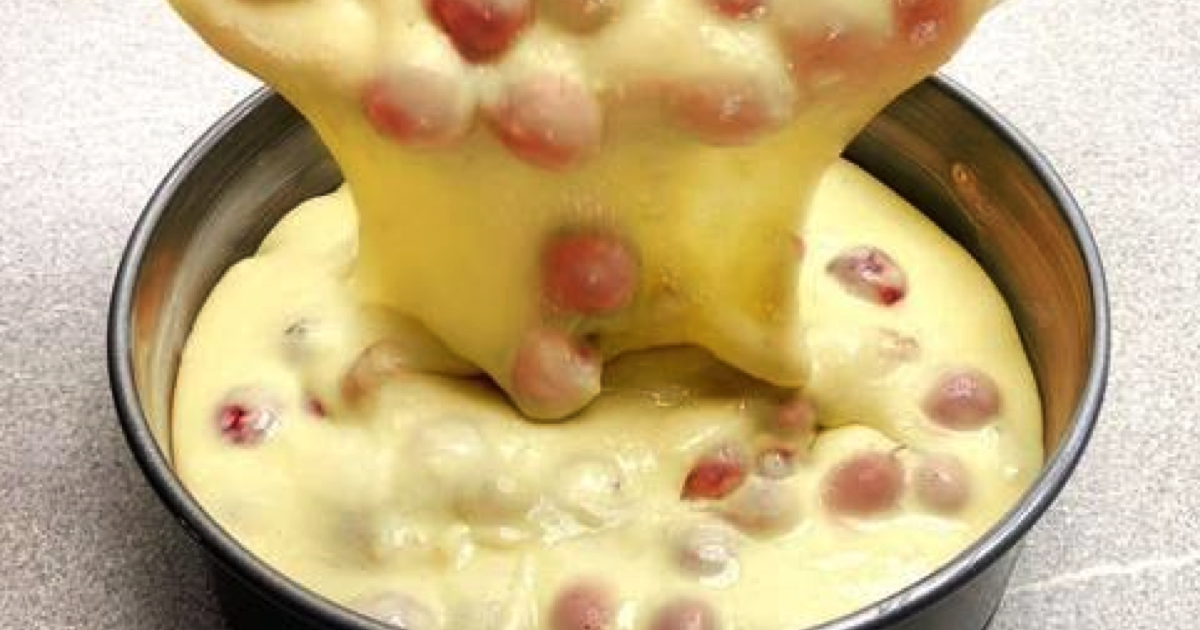2. Na koniec, dodaj umyte owoce i delikatnie wymieszaj łyżką. Gotowe ciasto, wyłóż do formy o średnicy 22-24 cm., wyłożonej papierem do pieczenia.