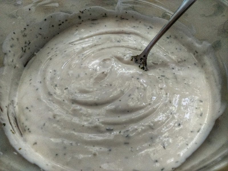 6. Czas na przygotowanie aromatycznego sosu: W misce, wymieszaj śmietanę z przeciśniętym przez praskę czosnkiem i przyprawami.