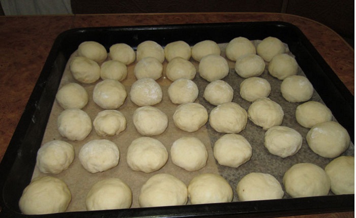 2. Z gotowego ciasta, uformuj małe kulki i poukładaj je na blaszce zachowując między nimi odstęp 1 cm. Postaw blaszkę w ciepłym miejscu na 5-10 minut.