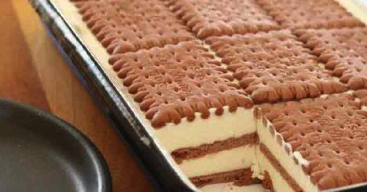 Zmieszaj biały ser z cukrem. Śmietankę ubij z mlekiem, dodaj proszek budyniowy. Do śmietanowej masy dodawaj po trochę twarożek, mieszaj, aż konsystencja będzie gładka i jednolita. Wyłóż blaszkę papierem do pieczenia. Powinna mieć wymiar 20 x 30 cm. Czas na nasączanie herbatników Wlej mleko na talerz lub do płaskiej miseczki i zanurzaj w nim ciastka na moment i rozkładaj w formie.