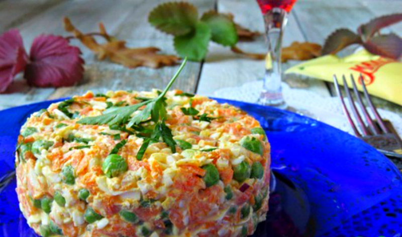 2. Do wygodnej miski, zetrzyj na tarce o grubych oczkach marchew, dodaj pokrojoną w drobną kostkę cebulę i schłodzony groszek. Dopraw solą, pieprzem, majonezem (lub jogurtem) i dokładnie wymieszaj.