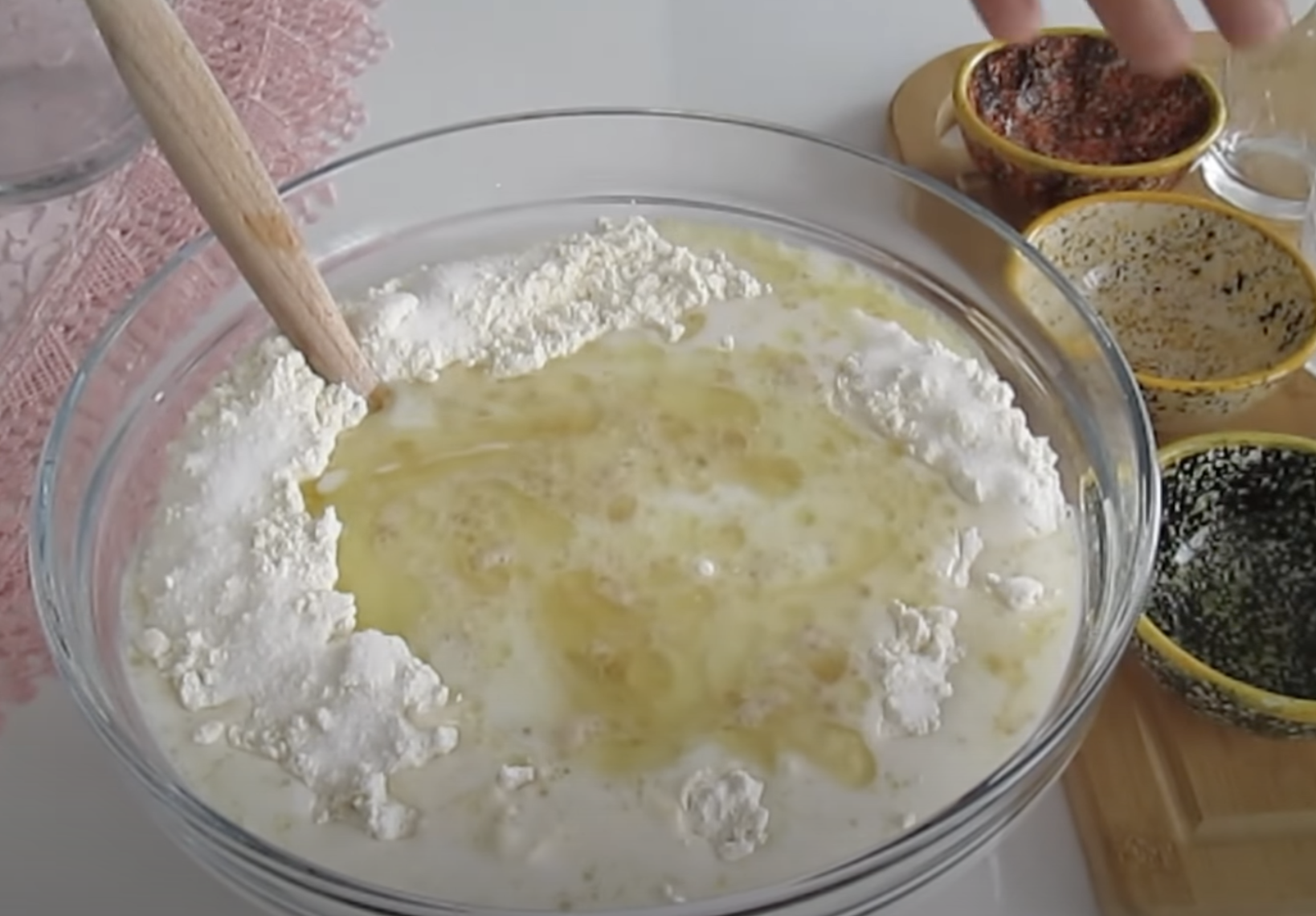 1. W wysokiej misce, wymieszaj przesiana mąkę z solą, drożdżami, wodą, mlekiem i olejem.