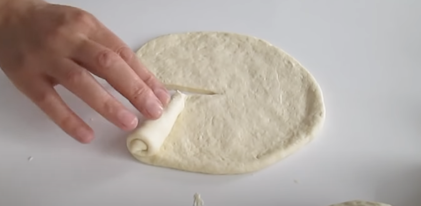 3. Z gotowego ciasta, uformuj małe kuleczki i każdą rozwałkuj na cienki, okrągły placek. Zrób nacięcie do połowy krążka i zroluj.