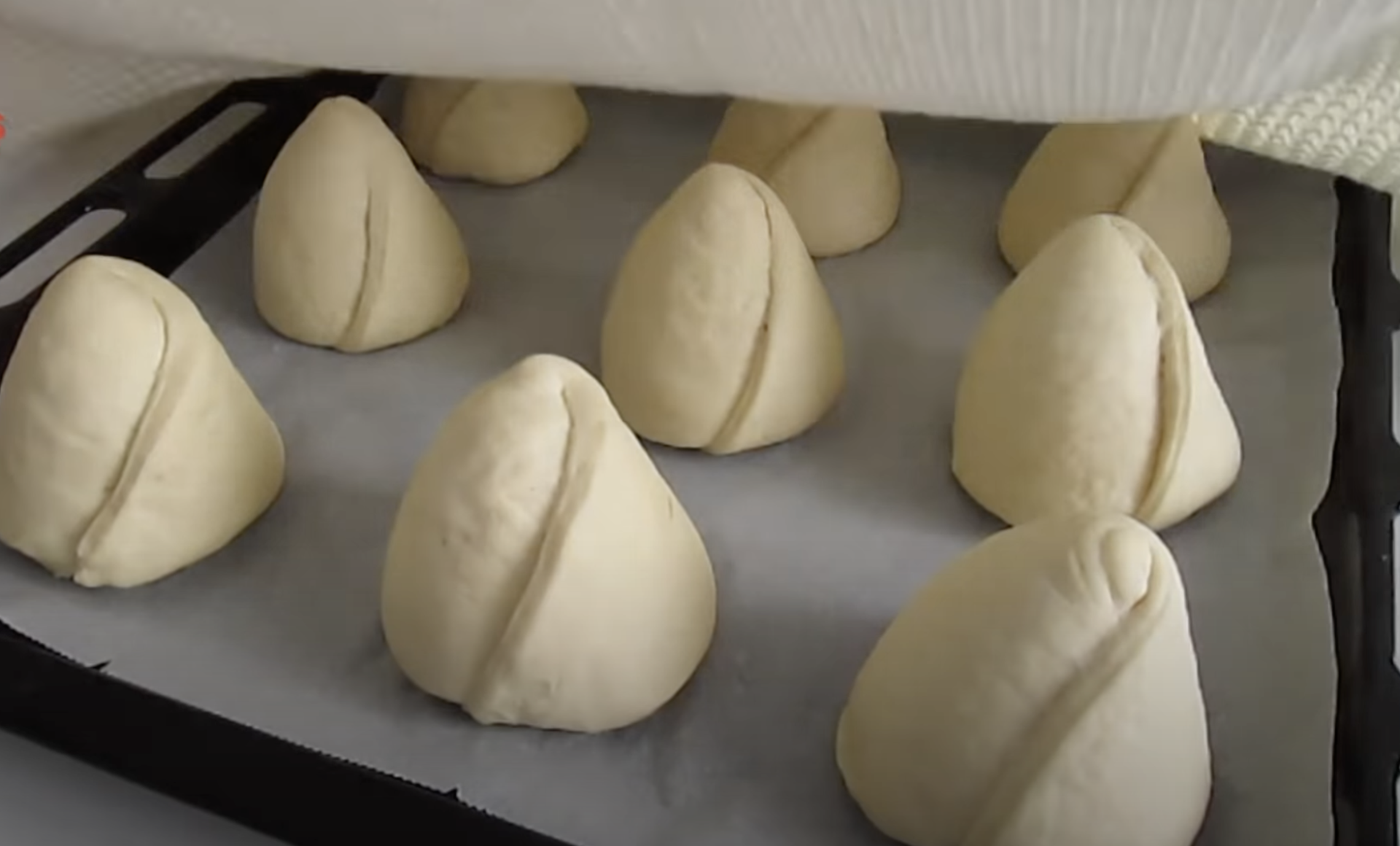 4. Układaj bułeczki na blaszce, przykrytej papierem do pieczenia, przykryj czystą ściereczką i odstaw na kolejne 15 minut. Pamiętaj, aby miedzy bułeczkami zachować odstęp.
