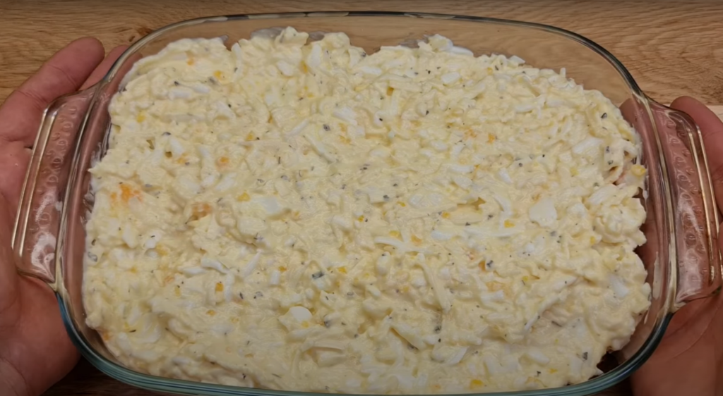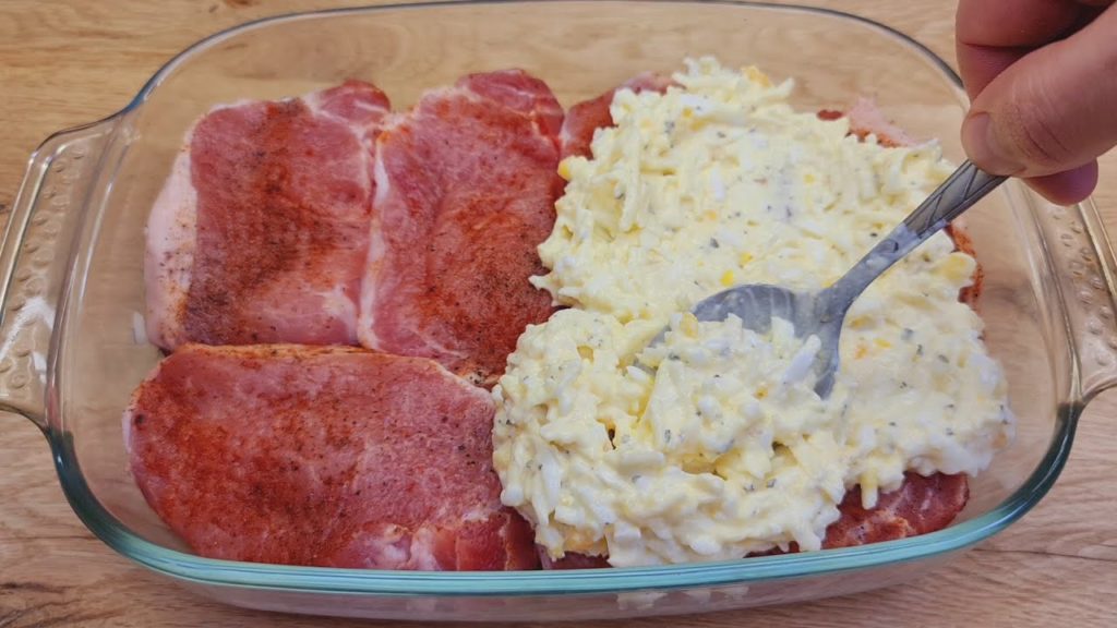 4. Plastry mięsa, poukładaj w naczyniu żaroodpornym, posyp drobno pokrojoną cebulą, przygotowaną wcześniej masą jajeczną i wygładź z wierzchu.