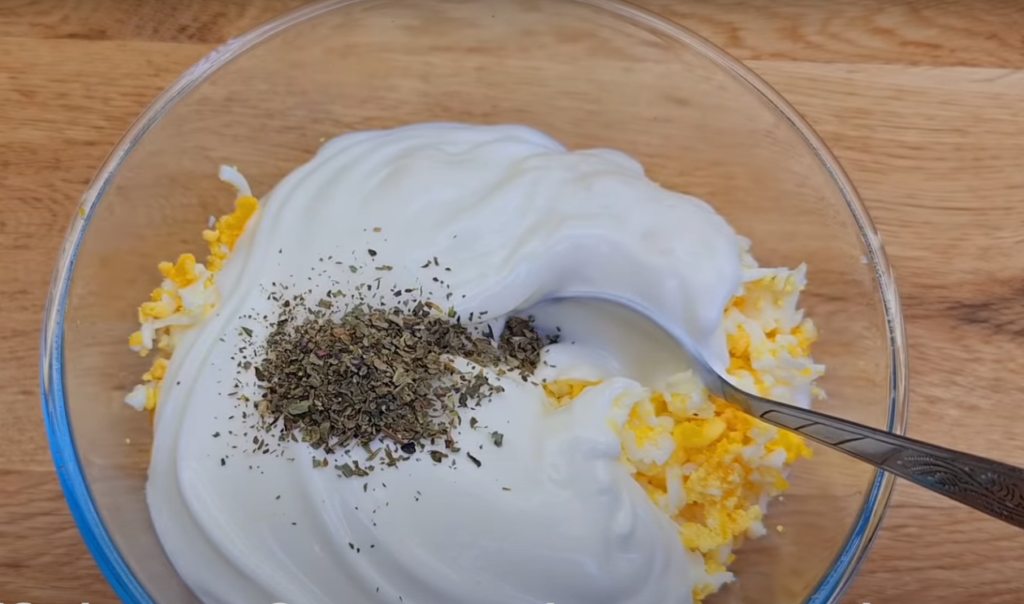 3. W misce wymieszaj drobno pokrojone jajka z jogurtem, startym na tarce o grubych oczkach serem i doprawiając solą, pieprzem oraz bazylią. Dobrze wymieszaj.