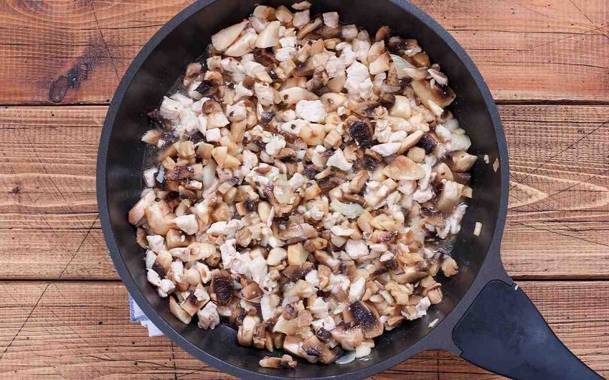 3. Pieczarki umyj, pokrój w kosteczkę i podsmaż na rozgrzanej patelni z olejem.