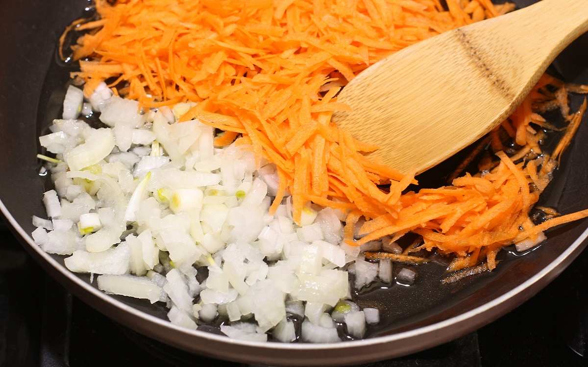 4. Drobno posiekaną cebulę i startą na tarce o grubych oczkach marchew, podsmaż osobno na rozgrzanej patelni z olejem.