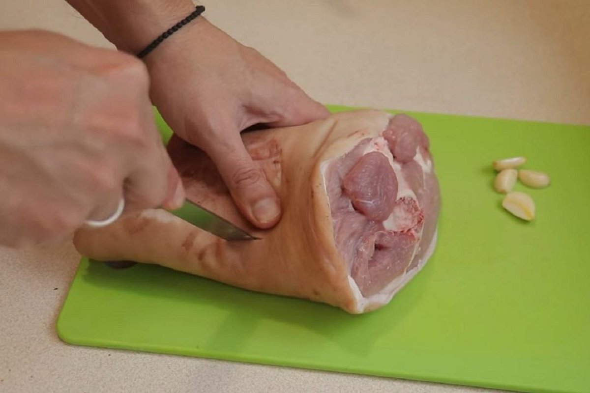 1. Golonkę oczyść, umyj i osusz ręcznikiem papierowym. W kilku miejscach, zrób małe ale głębokie nacięcia w mięsie i powkładaj w nie obrane ząbki czosnku.