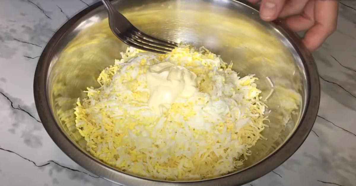1.Na twardo ugotuj wszystkie jajka, następnie zetrzyj je na tarce oraz zetrzyj również ser, po czym dodaj do nich drobno posiekany czosnek, sól oraz majonez.