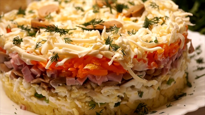 9.Całość posyp szczypiorkiem, następnie połóż starte jajka, całość wyrównaj, po czym dokładnie rozsmaruj łyżkę majonezu. Kolejna warstwa to pieczarki , na które panowanie rozsmaruj majonez , po czym całość posyp pokrojoną w kosteczkę szynką.