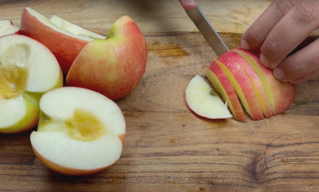 4. Jabłka umyj, obierz i usuń gniazda nasienne. Pokrój w cienkie plasterki.