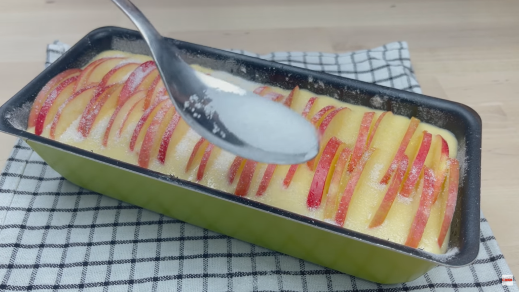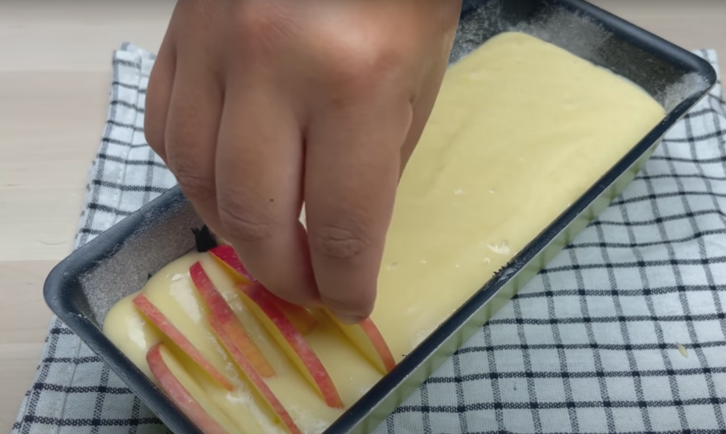 5. Gotowe ciasto, przełóż do formy, wysmarowanej masłem i posypanej mąką. Na wierzchu, ułóż równomiernie na całej powierzchni, plasterki jabłka oraz cienkie plasterki masła.