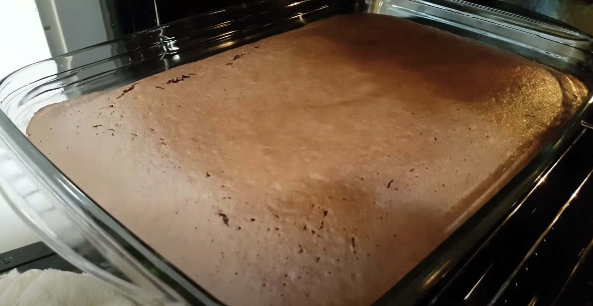 3. Przelej ciasto do formy o wymiarach 30 x 40 cm., wysmarowanej masłem i wygładź szpatułką.