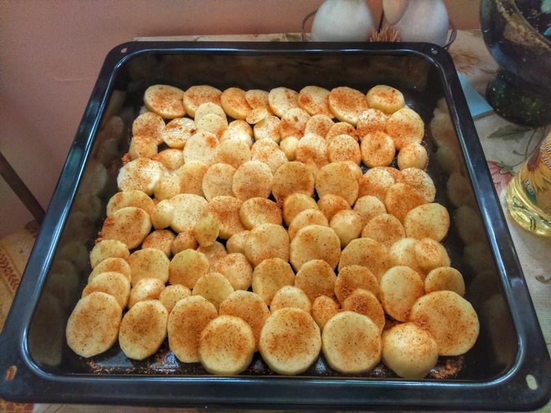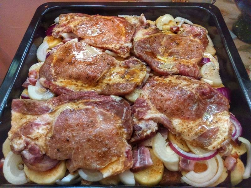W pozostałej marynacie marynujemy karkóweczkę. Ziemniaki rozkładamy na blaszce do pieczenia. Obydwie cebule kroimy w grube plasterki i rozkładamy warstwę na ziemniakach.