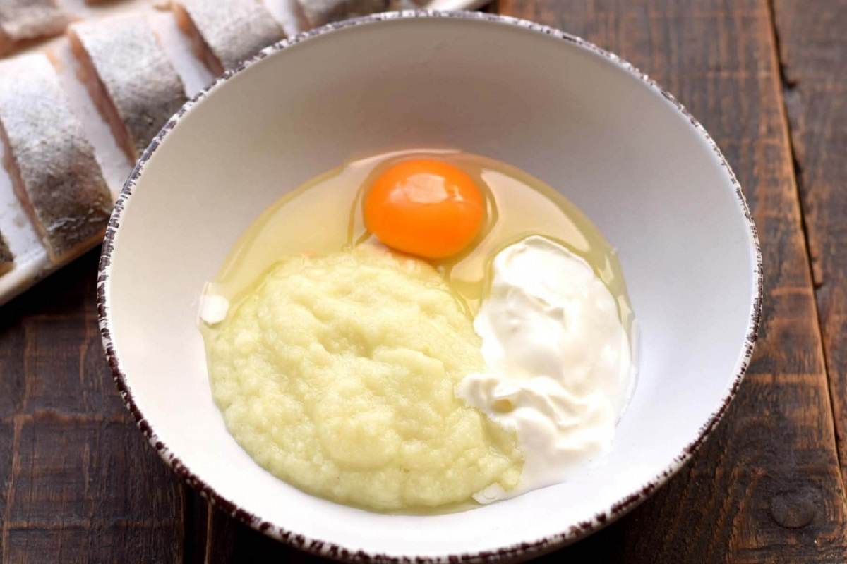 2.Następnie zacznij przygotowywać ciasto. Obraną cebulę oraz czosnek zmiel Blenderem, po czym przełóż do miski i dodaj jajko oraz śmietanę, całość bardzo dokładnie wymieszaj.
