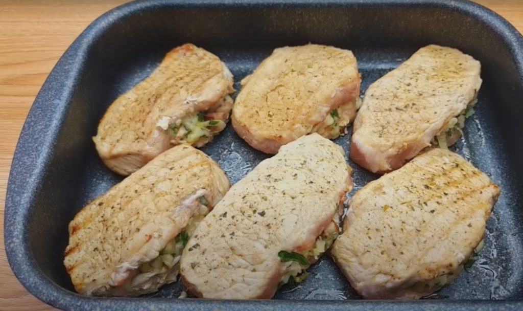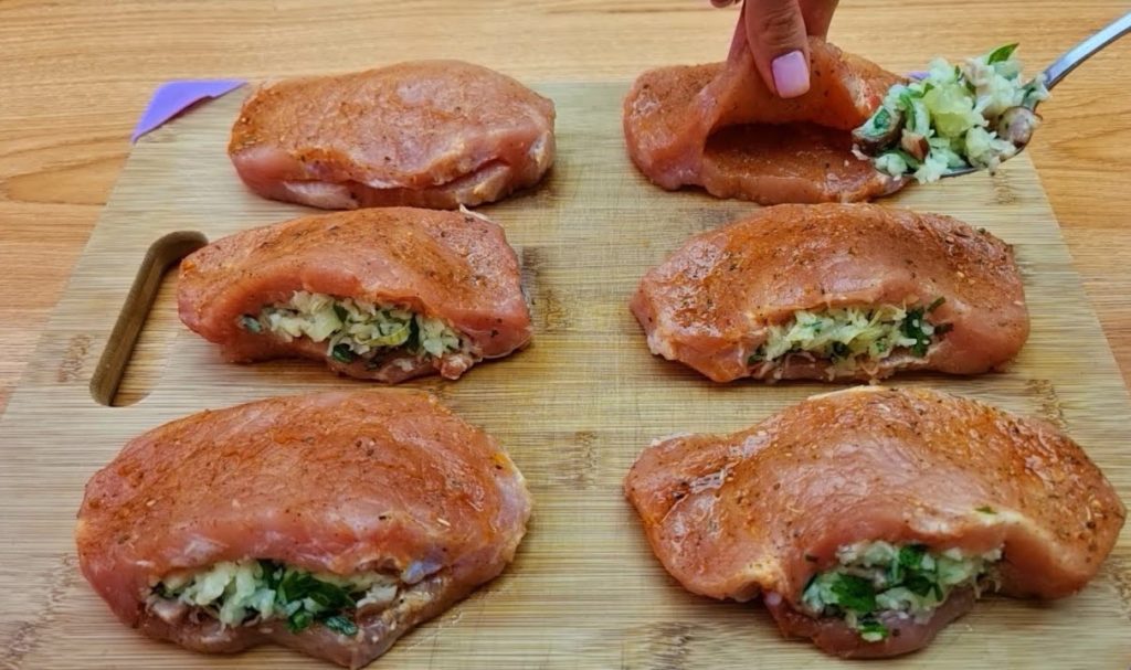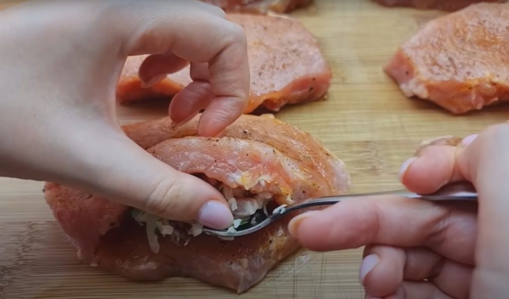 5. Przygotowane wcześniej plastry mięsa, wypełnij nadzieniem i wysmaruj z wierzchu marynatą.