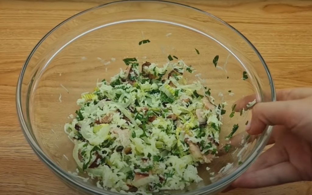 2. W tym czasie, w misce wymieszaj starty na tarce o grubych oczkach ser z posiekaną natką pietruszki. Dodaj zawartość miski do smażącego się boczku z cebulą.