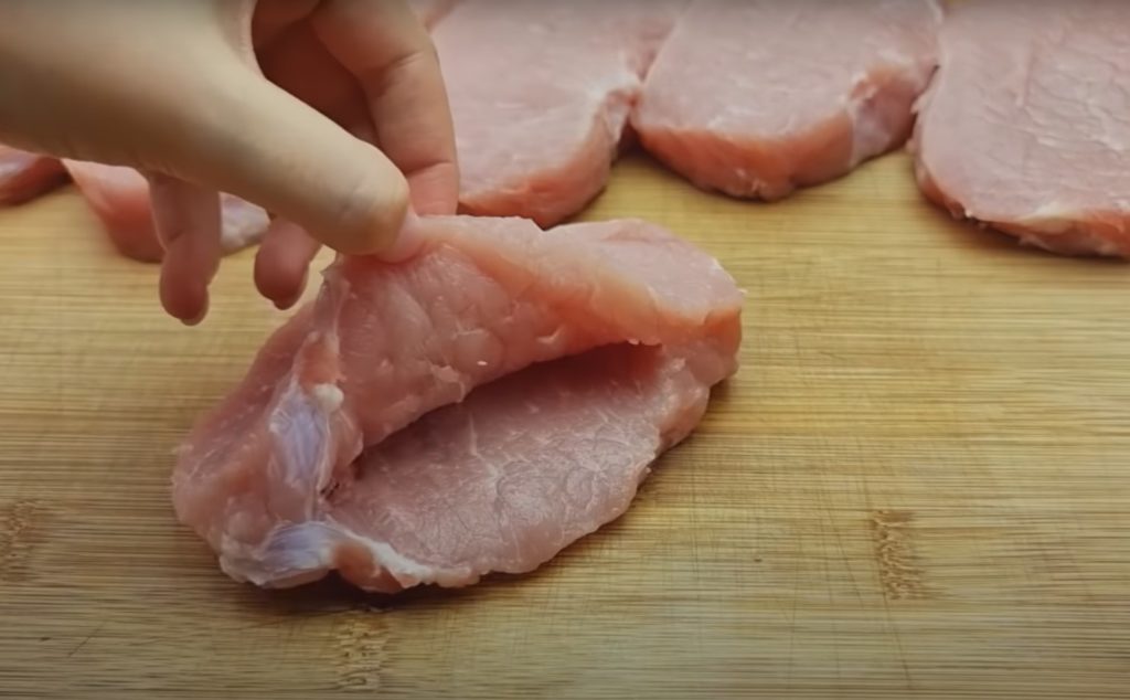 3. Polędwicę (lub schab), pokrój w grube plastry i zrób w każdym głębokie nacięcie, tworząc kieszonkę.