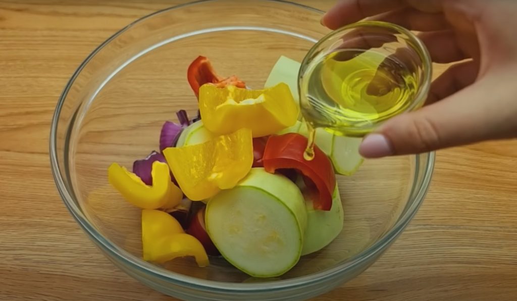 8. W tym czasie, umyj i pokrój pozostałe warzywa, przełóż je do miski i polej oliwą z oliwek. Dopraw do smaku solą, pieprzem i wymieszaj.