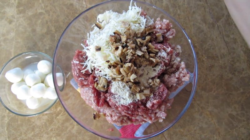 1. W dużej misce, wymieszaj mięso z pokrojoną w drobną kosteczkę cebulą, posiekanymi pieczarkami i przyprawami.