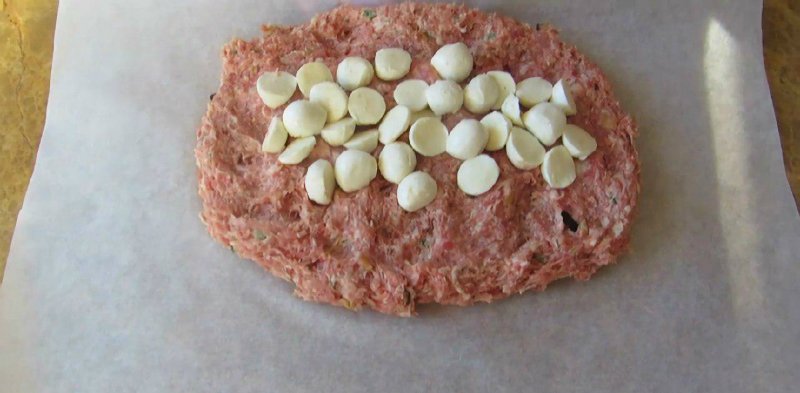 3. Mięso, wyłóż na papierze do pieczenia w cienkiej warstwie, formując prostokąt i poukładaj na środku, pokrojoną w plastry pozostałą mozzarellę.