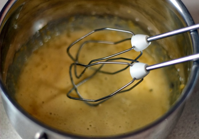3. Teraz przejdź do przygotowania kremu. W misce ubij żółtka z cukrem, aż masa zrobi się kremowa. Dodaj budyń waniliowy, aromat waniliowy i mleko, a następnie wszystko dokładnie wymieszaj trzepaczką, aby nie było grudek.