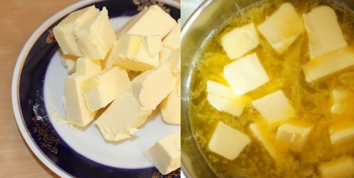 4. Wlej do garnka i gotuj na wolnym ogniu i często mieszaj aż zgęstnieje. Gotowy krem pozostaw do wystygnięcia. Potem dodaj pokrojone w kostkę miękkie masło i mieszaj przez ok. 3 minuty, aż uzyskasz delikatną masę. Gotowy krem podziel na dwie części.