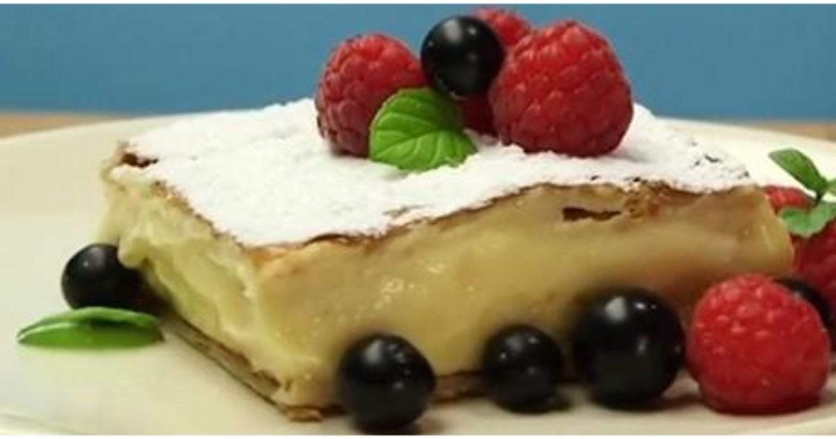 Przed podaniem, posyp kremówkę obficie cukrem pudrem i udekoruj ulubionymi owocami. Smacznego!