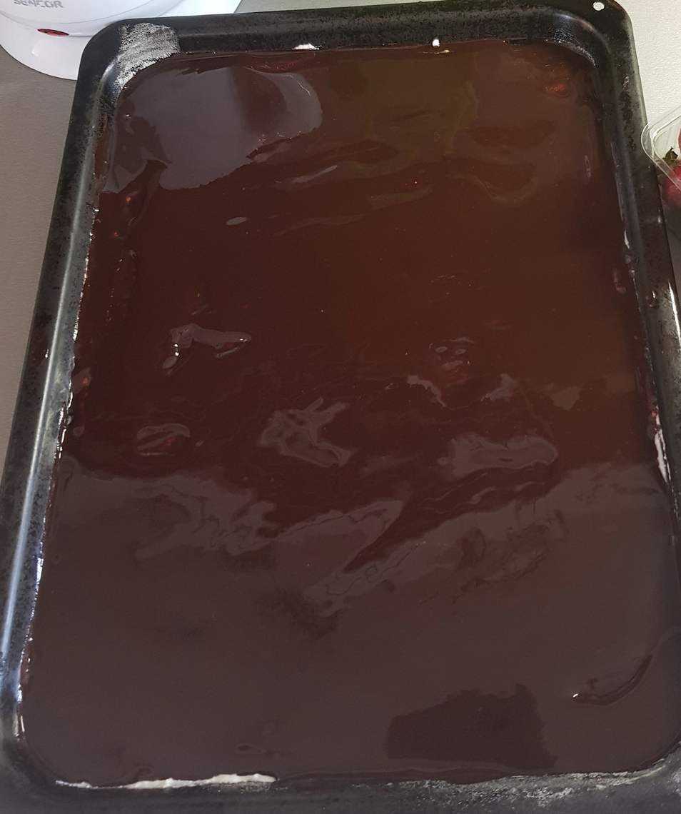 4. Pokruszoną czekoladę, rozpuść w kąpieli wodnej ze śmietanką do uzyskania jednolitej i gładkiej konsystencji. Gotową polewą, polej cały deser z wierzchu. Gotowe!