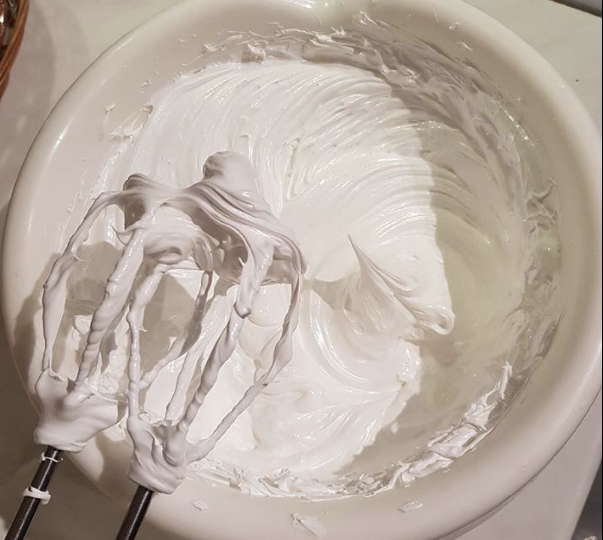 2. W wygodnej misce, ubij śmietankę ze skondensowanym mlekiem i bitą śmietaną. Następnie, dodaj żelatynę rozpuszczoną wcześniej w niewielkiej ilości ciepłej wody.