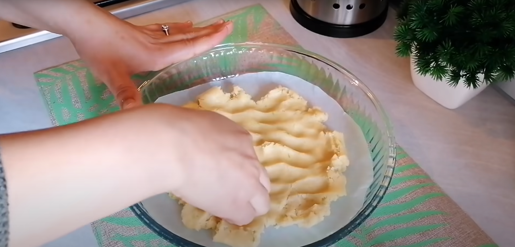 3. Okrągłą formę wyłóż papierem do pieczenia i wyłóż równomiernie na jej dno pozostałe ciasto.