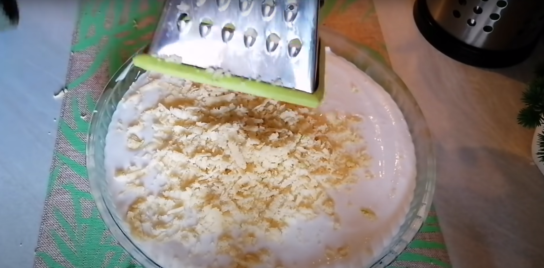 5. Wyłóż równomiernie przygotowany krem na warstwie ciasta, a na wierzch zetrzyj drugą połowę mrożonego ciasta.