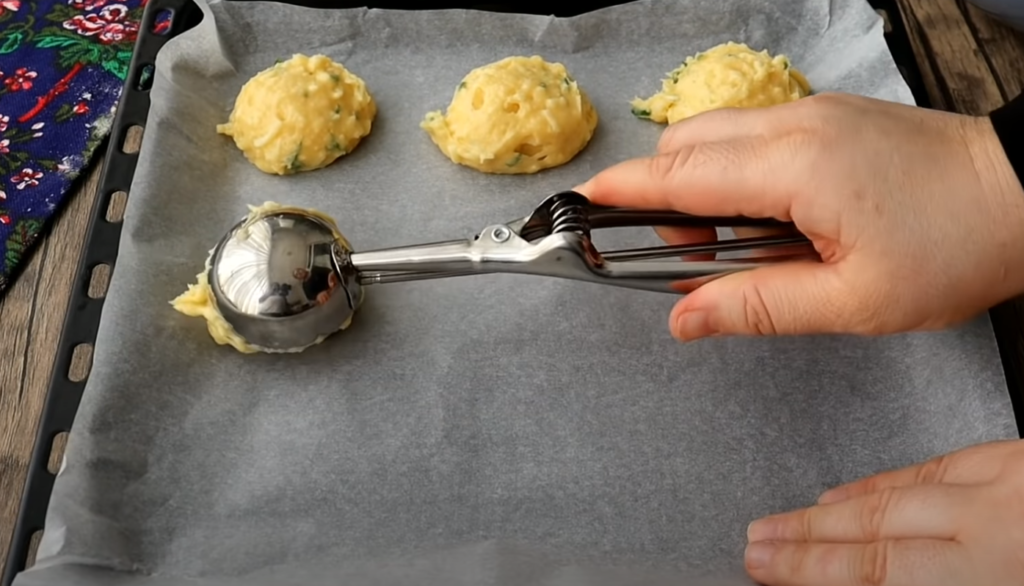 3. Na koniec, do masy dodaj startą mozzarellę  posiekaną natkę pietruszki. Uformuj z masy małe kulki i poukładaj je na blaszce, przykrytej papierem do pieczenia. Posyp z wierzchu, startym parmezanem.