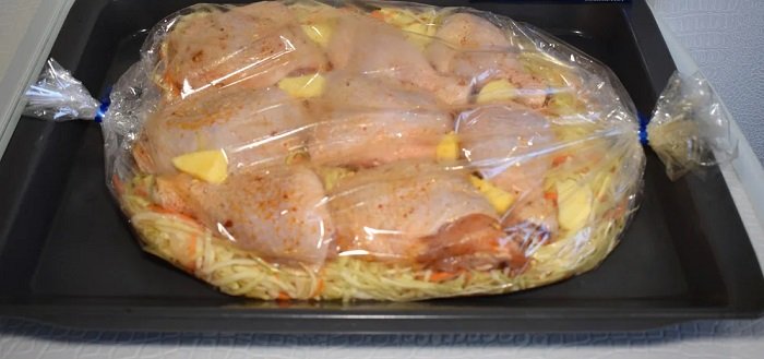 5. Teraz, przełóż warzywa do rękawa, a na nich poukładaj kurczaka w marynacie. Dodaj trochę masła i zabezpiecz szczelnie brzegi.
